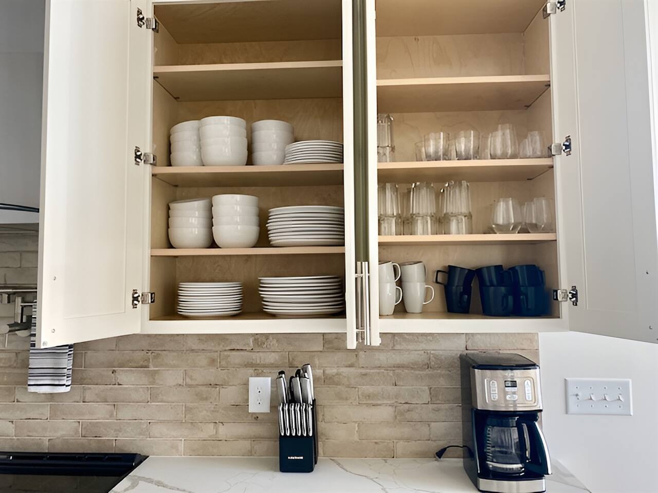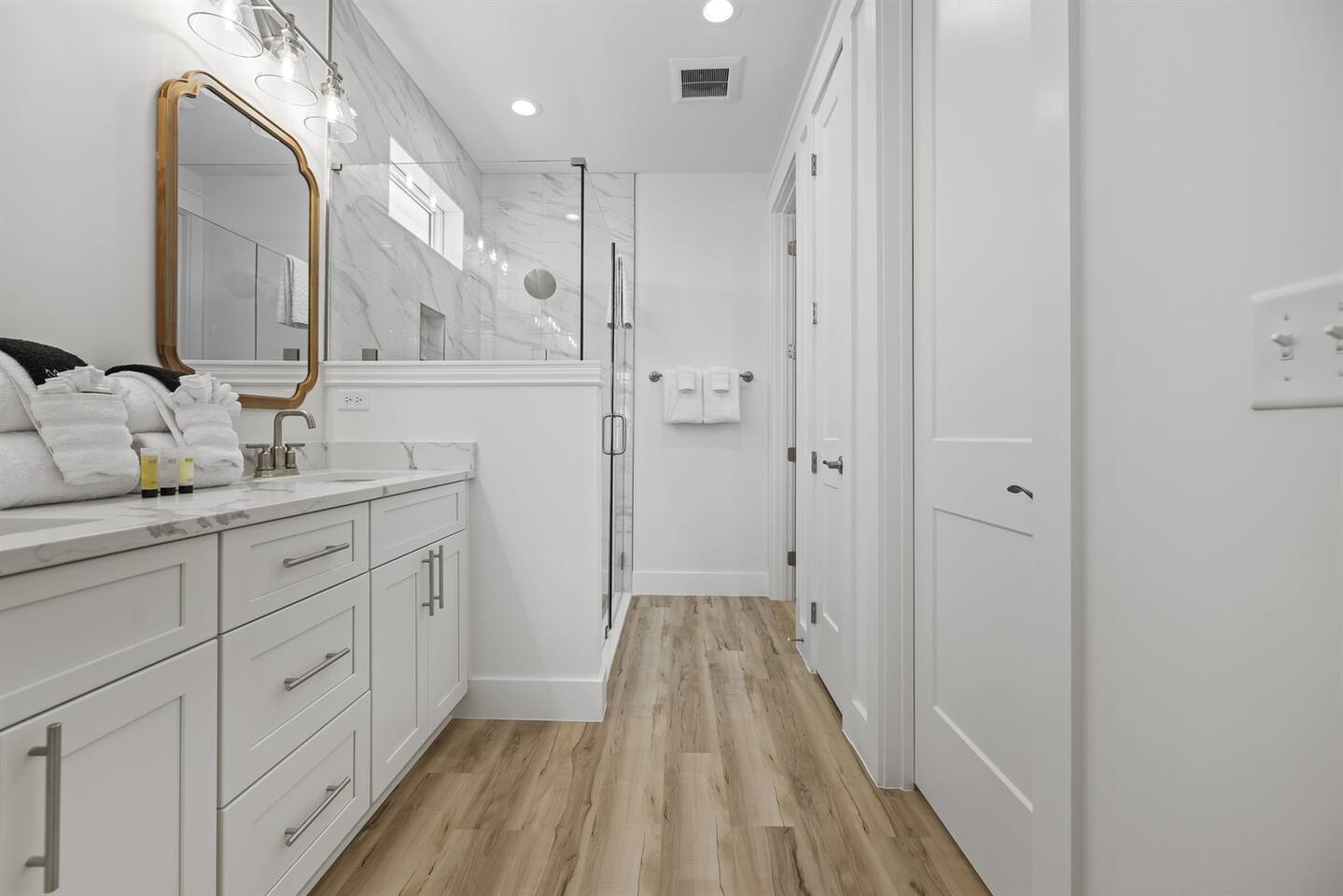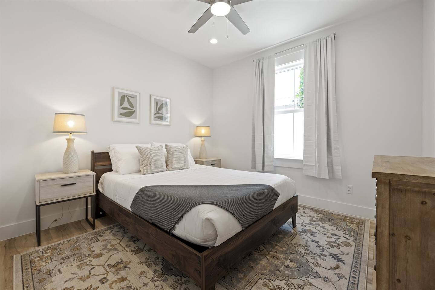 SLEEPING ARRANGEMENTS Sleeps 10 – 3 bedrooms (K, Q, F/F and T/T bunks) – plus 2 premium queen sofa sleepers 3 bedrooms and 2.5 baths • Master Bedroom with KING Bed - includes ensuite bath with walk-in shower, and large walk-in closet with plenty of hangers and 2 luggage racks. • Bedroom with QUEEN Bed – shares Full Hall Bath (Tub / Shower) with Bunk Room -closet with plenty of hangers and 2 luggage racks. • Bunk Room contains 2 sets of bunks – Full / Full and Twin / Twin with shared steps/stairs to both top bunks (no ladders) – closet with plenty of hangers. • 2 premium queen-size sofa sleepers located in main Living Space. • Additional half bath / powder room in the hall with sink for brushing teeth / hair / makeup. Designated Work Space • Desk and chair situated in front of well lit window, perfect for working / taking video calls. • Fast Wifi throughout the space. (300mbs/sec). The Living area includes: • 75” Smart TV with basic cable. • Games and books to enjoy in TV cabinet. Kitchen is fully equipped with • Stainless appliances • Dinnerware for 10 guests. Also included are: • Drip Coffee Maker with filters and instructions to easily make a pot of coffee. • Crockpot • Toaster • Pots, Pans and Baking supplies Dining Space: • Counter-height Table with 8 chairs. • 4 bar stools at the Kitchen Island. • 2 additional stools to use as needed • High Chair available Backyard • Private, fenced in back yard • Covered patio with LED Patio Lights • Seating for 10 Laundry Room with oversized Washer & Dryer. Family Friendly items include Plastic / unbreakable dinnerware Pack & Play High Chair Games / Puzzles / Books Free On-site Parking: • Up to 4 cars in the the driveway, depending on the size of vehicles. • NO Parking allowed in the garage, however, please use the garage to store your personal items / equipment during your stay.