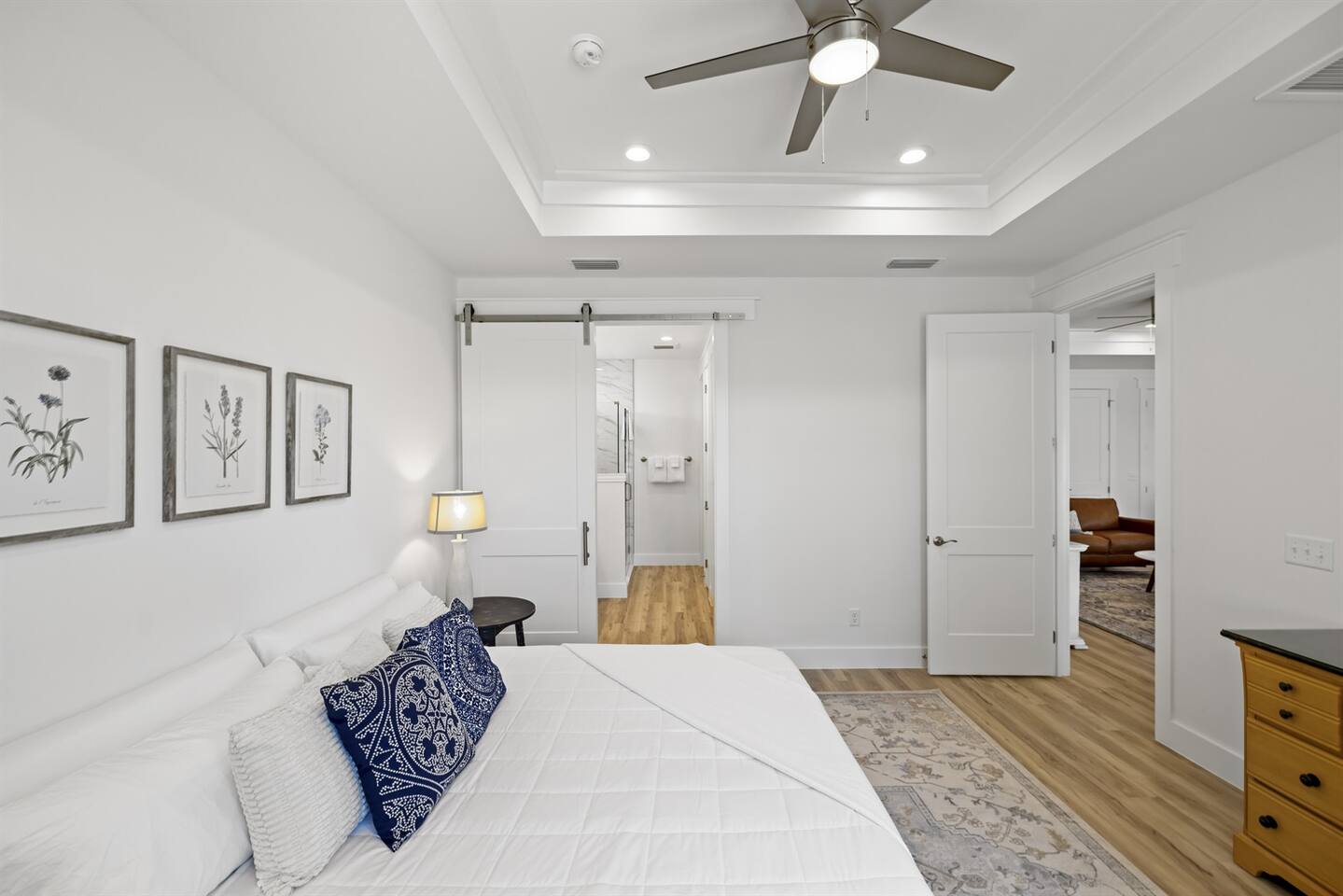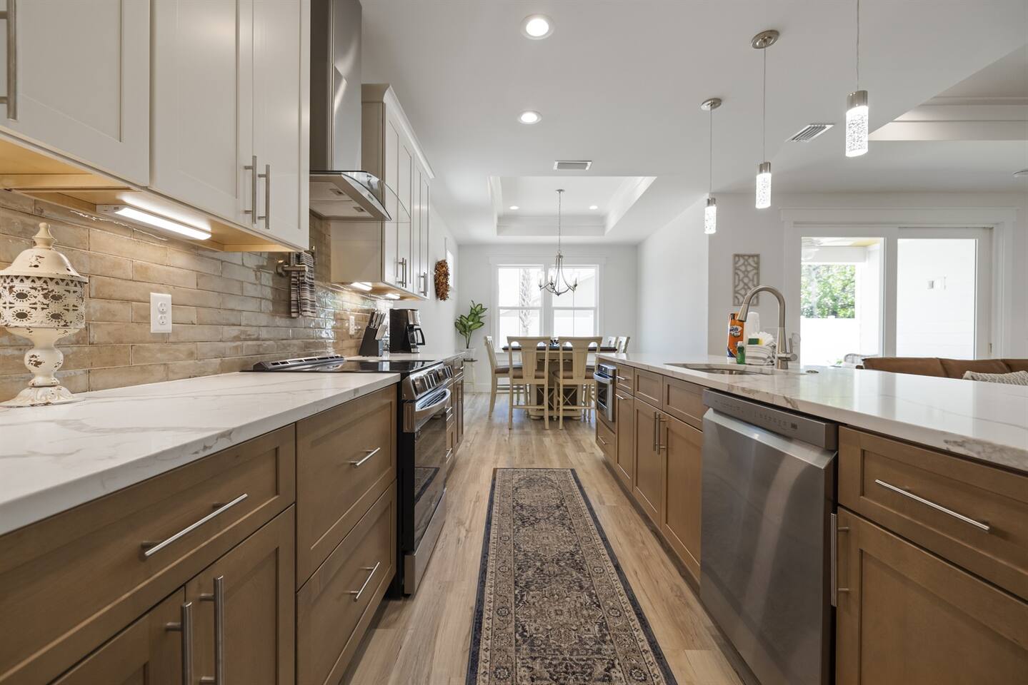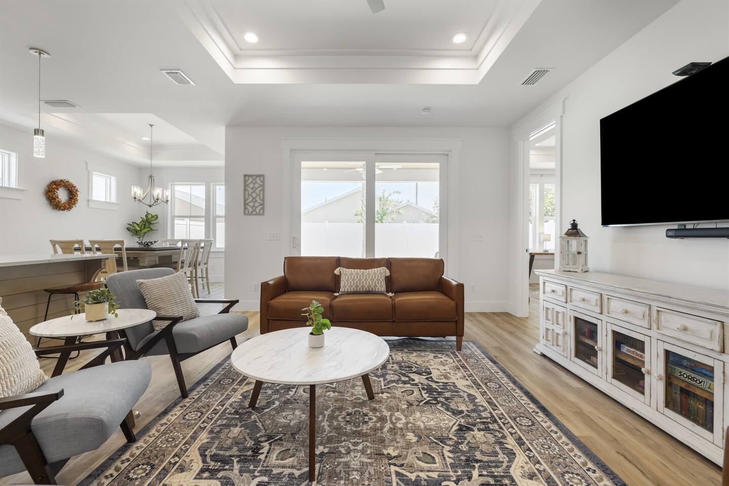 SLEEPING ARRANGEMENTS Sleeps 10 – 3 bedrooms (K, Q, F/F and T/T bunks) – plus 2 premium queen sofa sleepers 3 bedrooms and 2.5 baths • Master Bedroom with KING Bed - includes ensuite bath with walk-in shower, and large walk-in closet with plenty of hangers and 2 luggage racks. • Bedroom with QUEEN Bed – shares Full Hall Bath (Tub / Shower) with Bunk Room -closet with plenty of hangers and 2 luggage racks. • Bunk Room contains 2 sets of bunks – Full / Full and Twin / Twin with shared steps/stairs to both top bunks (no ladders) – closet with plenty of hangers. • 2 premium queen-size sofa sleepers located in main Living Space. • Additional half bath / powder room in the hall with sink for brushing teeth / hair / makeup. Designated Work Space • Desk and chair situated in front of well lit window, perfect for working / taking video calls. • Fast Wifi throughout the space. (300mbs/sec). The Living area includes: • 75” Smart TV with basic cable. • Games and books to enjoy in TV cabinet. Kitchen is fully equipped with • Stainless appliances • Dinnerware for 10 guests. Also included are: • Drip Coffee Maker with filters and instructions to easily make a pot of coffee. • Crockpot • Toaster • Pots, Pans and Baking supplies Dining Space: • Counter-height Table with 8 chairs. • 4 bar stools at the Kitchen Island. • 2 additional stools to use as needed • High Chair available Backyard • Private, fenced in back yard • Covered patio with LED Patio Lights • Seating for 10 Laundry Room with oversized Washer & Dryer. Family Friendly items include Plastic / unbreakable dinnerware Pack & Play High Chair Games / Puzzles / Books Free On-site Parking: • Up to 4 cars in the the driveway, depending on the size of vehicles. • NO Parking allowed in the garage, however, please use the garage to store your personal items / equipment during your stay.